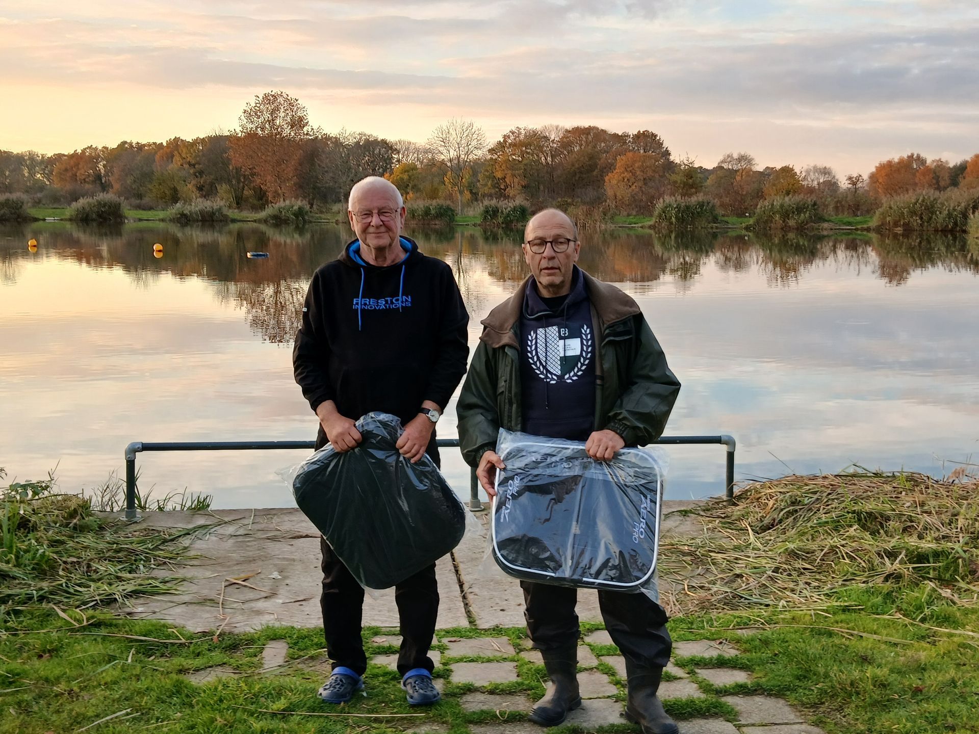 Hierna volgde het belangrijkste van de dag namelijk het overhandigen van de Checks aan de vertegenwoordigers van het Veteranen Search Team te weten Henny en Cees Mols en Anna en Steve Slater voor het Royal British Legion. Het totale bedrag van deze Liefdadigheids wedstrijd was geëindigd op € 960,- en zo konden beide partijen een mooi bedrag van € 480,- in ontvangst nemen. Beide partijen zijn zeer dankbaar voor het bedrag en bedanken dan ook iedereen die hieraan heeft bijgedragen en de vereniging voor het beschikbaar stellen van hun mooie vijver. Hopende op een vervolg nemen Cees en Henny dan afscheid omdat ze nog andere verplichtingen hadden die dag. Anna die tevens de taak van het Hamburgers bakken samen met Peggy voor deze dag op zich hadden genomen gaan nog even door hiermee en is het nog gezellig in de hut samen met de deelnemers die zijn gebleven om dit spektakel van begin tot het eind mee te maken. Maar zoals altijd komt er dan een tijd van opruimen en na dit gezamenlijk met de vrijwilligers gedaan te hebben keren ook de laatste deelnemers en vrijwilligers huiswaarts en rest ons om alle sponsoren en deelnemers nogmaals te bedanken voor hun bijdrage aan deze “wedstrijd”, zo ook de vrijwilligers voor hun inzet. We noemen ze nog 1 keer met naam……