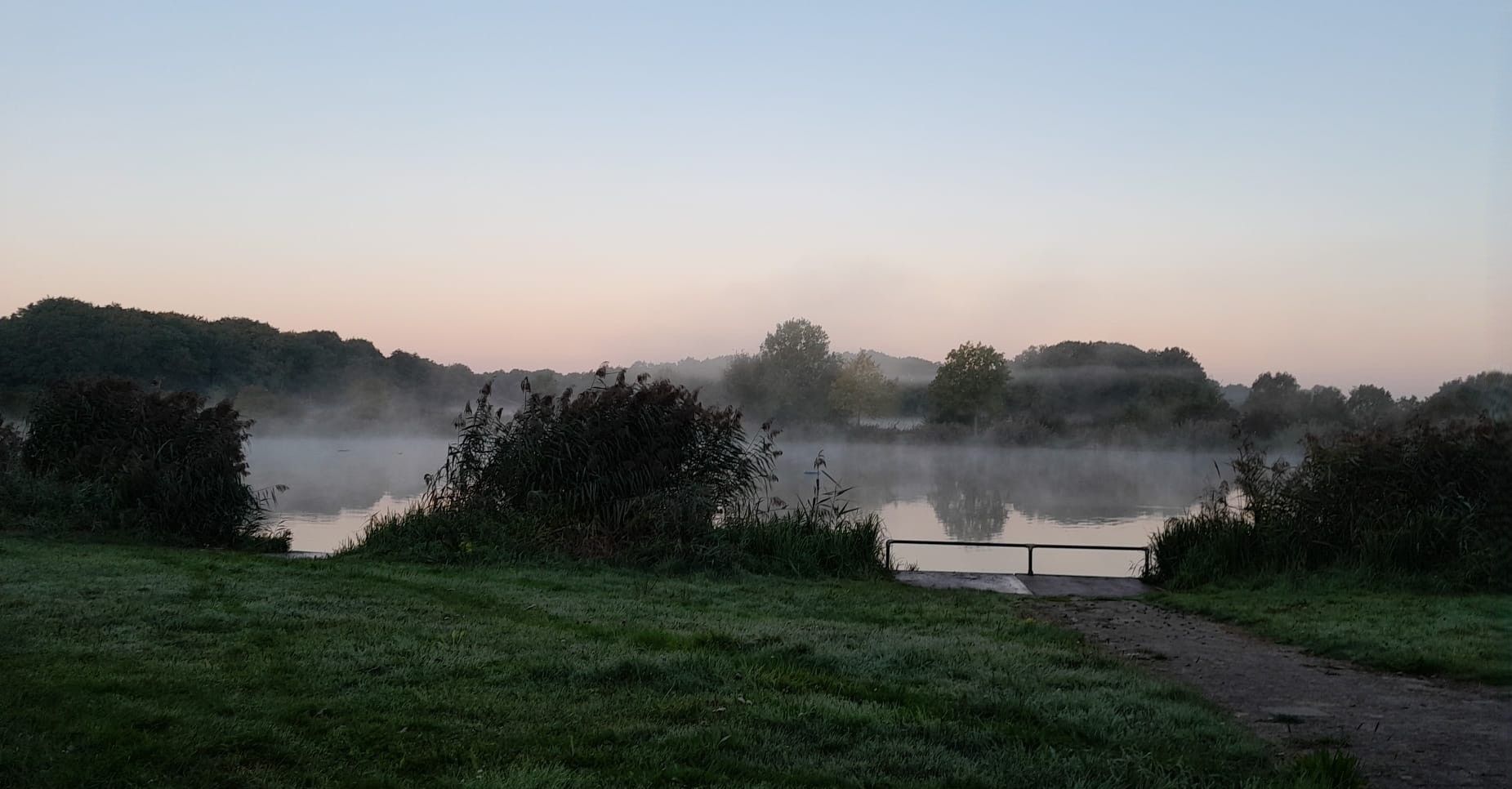 Nadat dit was gedaan kwamen al de eerste vroege vogels die de Finale van het ONK Dobbervissen zouden gaan strijden op onze vijver De Groene Bleek in de Holst. Gelijk kwamen al enkele opmerkingen van hoe mooi onze vijver wel niet was, vooral nu de mist zo mooi over het water trok…. (zie foto).