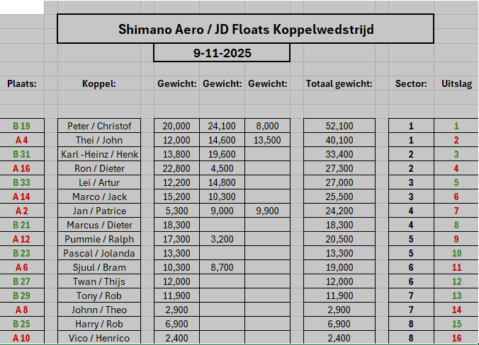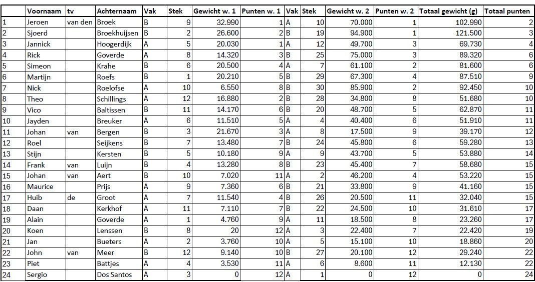 In vak B had op nummertje 19 Sjoerd Broekhuijsen plaats genomen en hij maakte dan ook dankbaar gebruik van de “Kopplaats en haalde maar liefst 94,9Kg aan de kant om in de netten te plaatsen. Vak A op nummer 10 haalde Jeroen van den Broek knap 70Kg aan de kant.