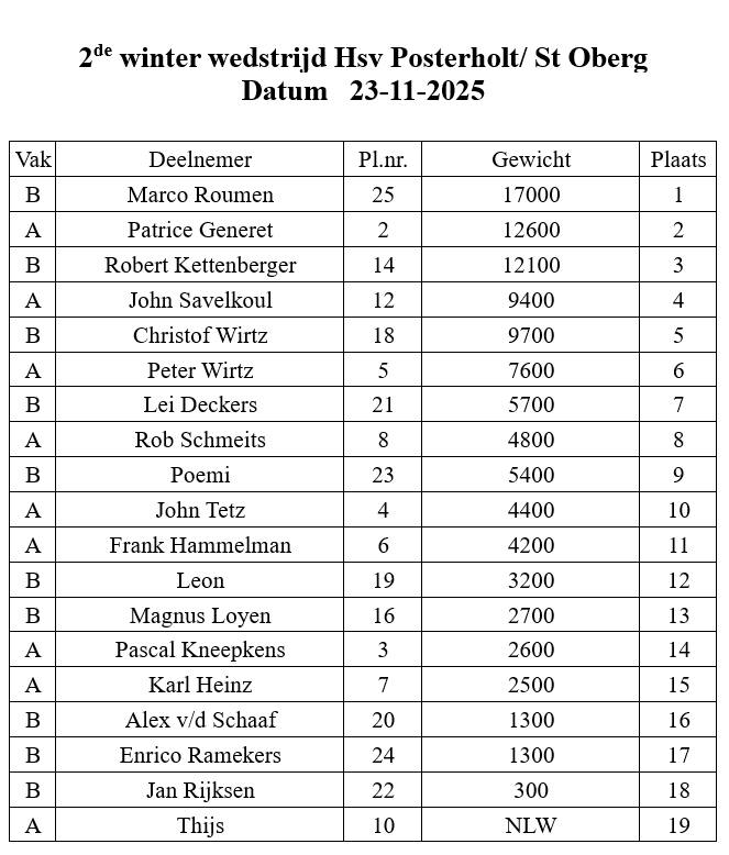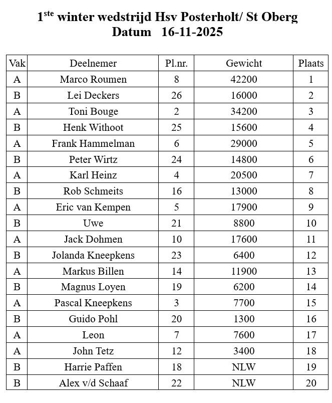 - De Winter wedstrijden zijn alleen voor Leden van de vereniging. Wedstrijd duur is 5 uur. Loting voor de plaats is 1,5 uur voor aanvang.