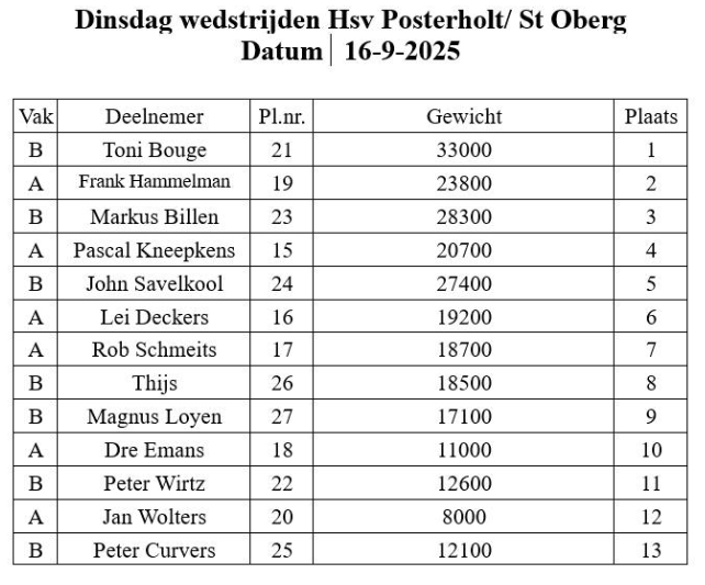 - Loting 07:30 uur, Aanvang wedstrijd 9:00uur tot en met 14:00 uur. Aansluitend wegen en Prijs uitreiking.