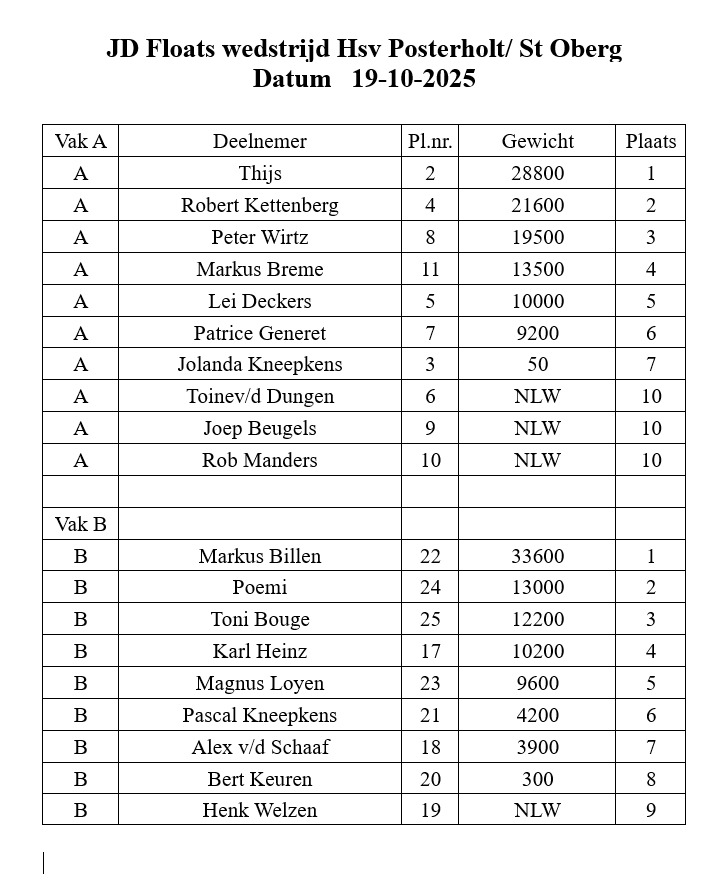 - De Open Individuële wedstrijden zijn wedstrijden die samenwerking met JD Floats worden georganiseert. Voor de uitslag klik op de Rode knop.